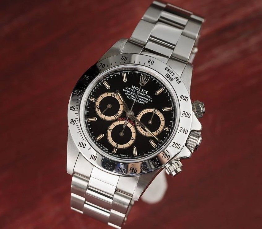 Among those original Zenith models, the all-steel ref. 16520 came with the option of either a black or white dial and, as is standard practice at Rolex, several elements of each were tweaked minutely throughout the watch’s life. In total, there are five distinct “Marks” of the Zenith Daytona’s dial, but among the most valuable today are the black Mark IV versions, prices of which can reach up to twice what you would pay for a similar white dial model.